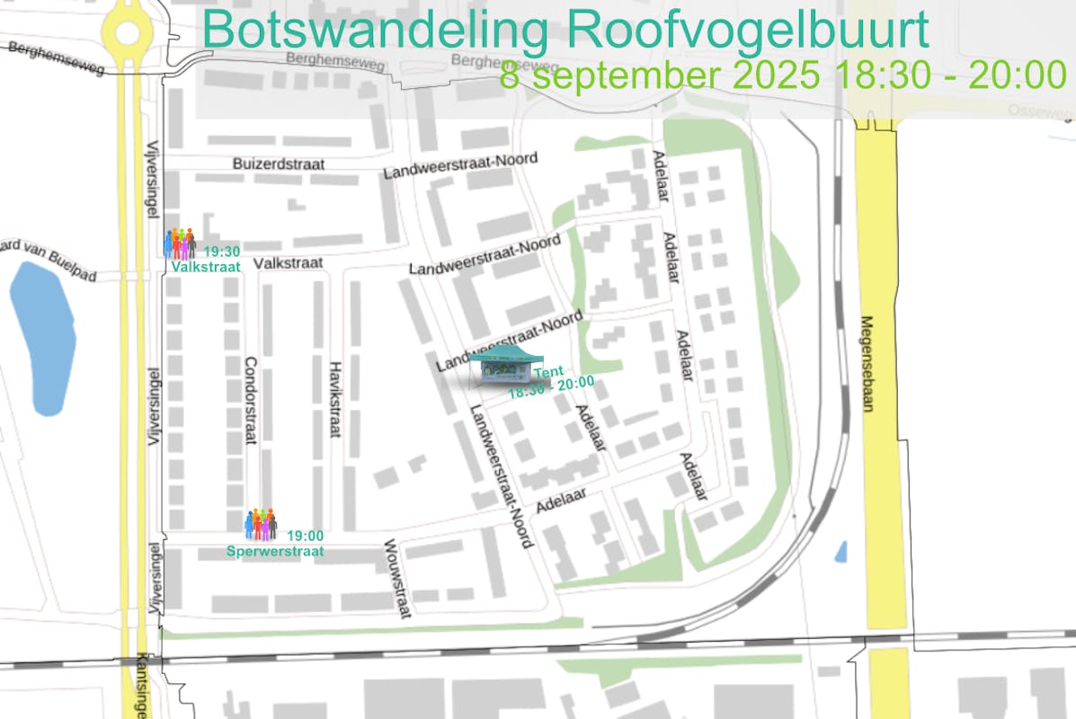 Onze tent staat op het grasveldje aan de Landweerstraat. Daar altijd iemand aanwezig. Ondertussen bezoeken we de Sperwerstraat om 19:00 en de Valkstraat om 19:30.