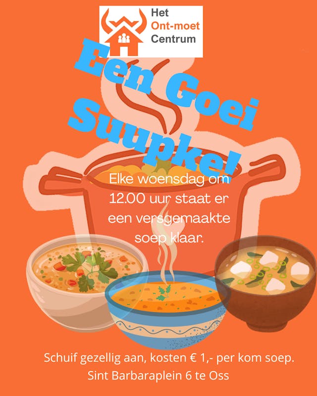 Samen met buurtgenoten een soepje eten. Wij zorgen elke week voor een pan verse soep. Schuif gezellig aan, gratis een kom soep per persoon.