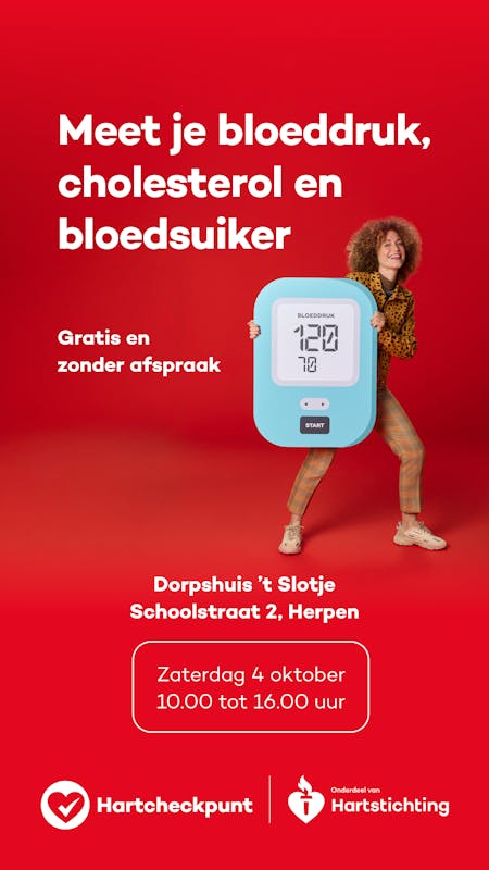 Op zaterdag 4 oktober 2025 kun je gratis je bloeddruk, cholesterol en bloedsuiker laten meten en in gesprek over je leefstijl in Dorpshuis ’t Slotje (Schoolstraat 2, Herpen).