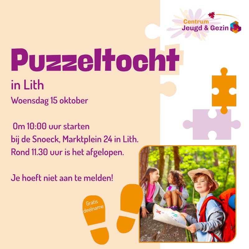 Doen jullie gezellig mee met de puzzeltocht in de herfstvakantie? Voor ouders/verzorgers en hun kind(eren), gezellig samen wandelen en puzzelen in Lith. Neem zelf een flesje water mee. Wij zorgen voor iets lekkers!