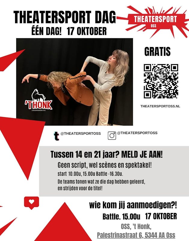 Herfstvakantie saai? Nou nee, want Theatersport Oss organiseert een gratis #theatersportbattle in 't Honk in Oss op 17 oktober.