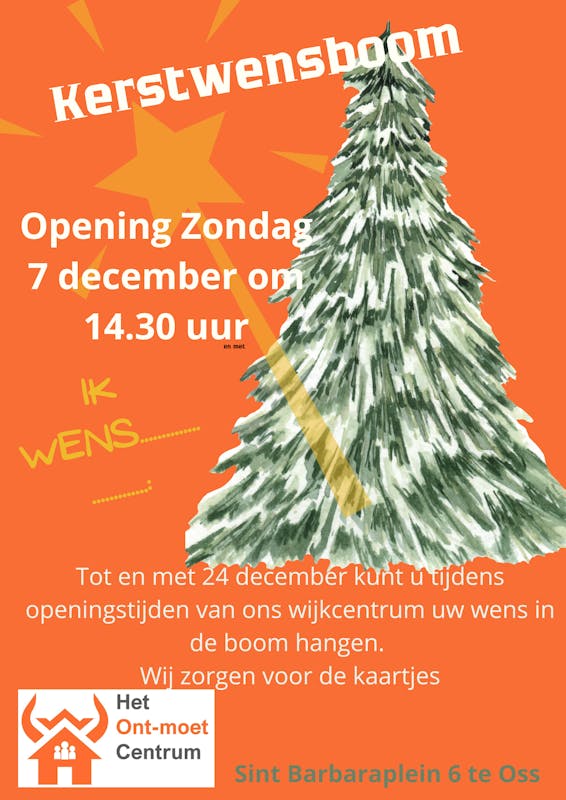 Op zondag 7 december om 14.30 uur wordt de boom feestelijk geopend met mooie muziek en brengen we gezamenlijk een proost uit, zodat alle wensen gehoord worden. De wensboom is tot en met 24 december te bezoeken tijdens onze openingstijden. Wij zorgen voor de kaartjes, jij hangt je in de boom.