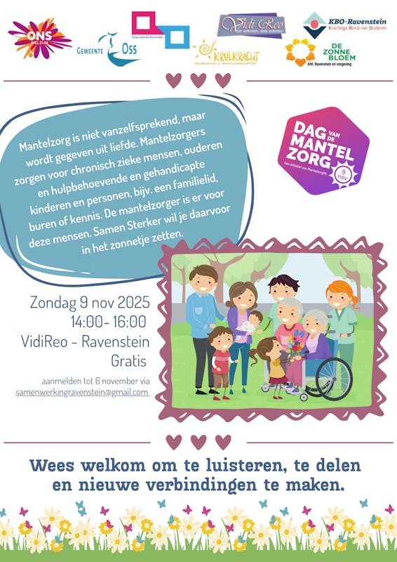 Deze middag wordt georganiseerd door KBO Ravenstein, Zorgcoöperatie Ravenstein, De Zonnebloem, De Vreugdefabriek, KrulKracht, Gemeente Oss en Ons-Welzijn. Samen hopen zij dat mantelzorgers een fijne middag vol waardering en ontspanning beleven.