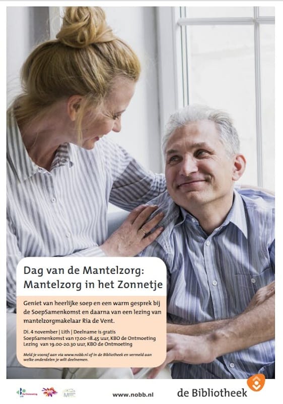 Op 4 november wordt er in de Maasdorpen stilgestaan bij mantelzorgers. In "De Ontmoeting" in Lith wordt er in samenwerking met de Bibliotheek Lith en KBO de Ontmoeting een moment georganiseerd om mantelzorgers in het zonnetje te zetten. ONS welzijn zorgt voor een heerlijk soepje en 's avonds is er een lezing van een mantelzorgmakelaar.