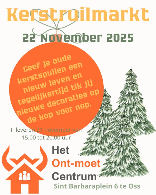Een zolder vol kerstballen, kerstbomen, kerststallen, kerstslingers, kerstlichtjes en andere kerstartikelen en toch wil je wat anders. Ruim je zolder op en lever deze spullen in op vrijdag 21 november van 15.00 tot 20.00 uur bij ons wijkcentrum. Je ontvangt waardebonnen om op zaterdag 22 november tussen 11.00 en 16.00 uur andere kerstspullen uit te komen zoeken. Heb je niets in te leveren, maar wil je toch wat nieuws, dan ben je op 22 november tussen 15.00 en 16.00 uur welkom. Bij de ingang ontvang je waardebonnen die je kunt inruilen voor kerstspullen.