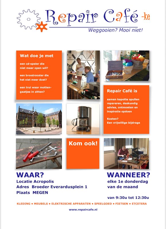 Bij het Repair Café'ke kun je terecht met spullen of apparatuur die kapot is, kleding of voor deskundig advies. Iedere eerste donderdag van de maand, de koffie staat klaar.