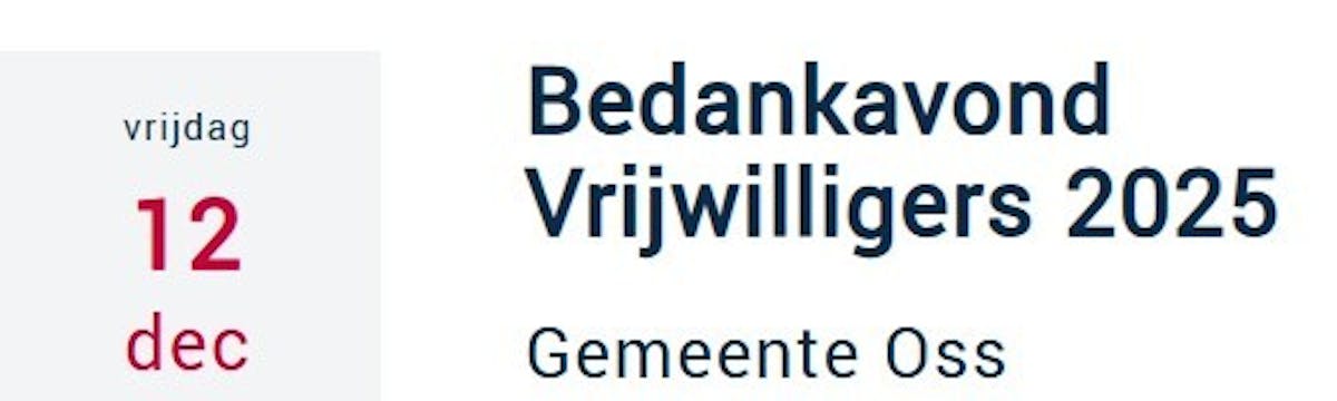 Ben jij een vrijwilliger in de gemeente Oss? Om jou te bedanken, zet Gemeente Oss je op vrijdag 12 december 2025 in het zonnetje met deze Bedankavond voor Vrijwilligers. Kom genieten van een gezellig en verzorgd avondje uit!