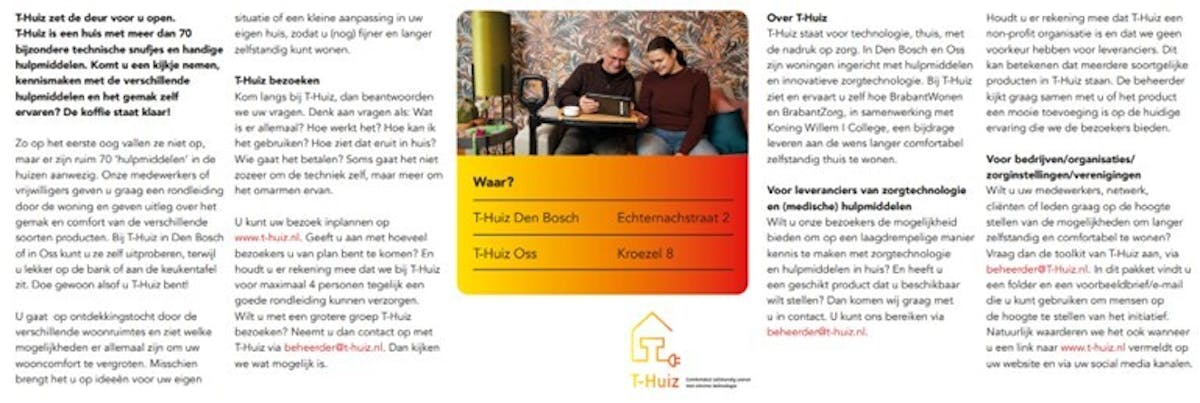 Bij het T-Huiz kunt u zien en ervaren hoe u zo zelfstandig mogelijk kunt wonen met behulp van technologie. Soms met technische hoogstandjes, maar minstens zo vaak met eenvoudige slimmigheden en aanpassingen. Zie de flyer hieronder.