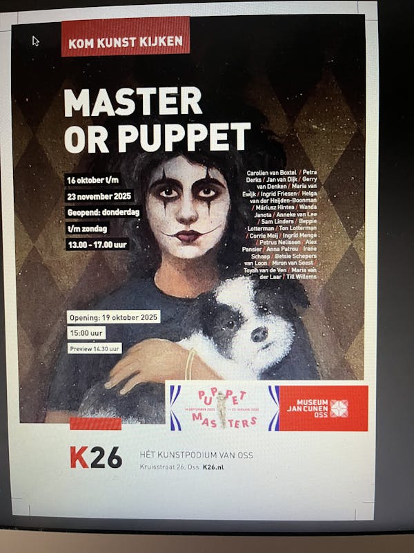 Het Osse poppentheater Marag vormt dit jaar het vertrekpunt voor twee tentoonstellingen rond de intrigerende relatie tussen pop en poppenspeler. Vanuit dit stukje lokale geschiedenis wordt het thema opengetrokken naar een brede en actuele context. In Museum Jan Cunen gebeurt dat met Puppet Masters, waar gerenommeerde kunstenaars uit binnen- en buitenland via de pop de meest uiteenlopende verhalen verbeelden. Bij K26 reageren lokale kunstenaars in de zuster-expositie Master or Puppet met hun eigen persoonlijke visies.