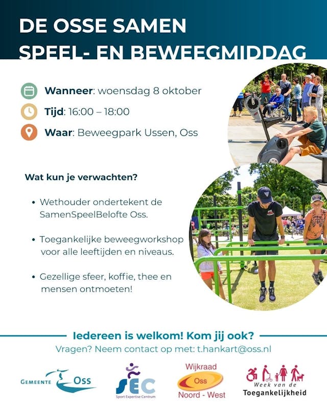 Op woensdag 8 oktober om 16:00 uur organiseert de gemeente Oss, samen met het Sport Expertise Centrum en de Wijkraad Oss Noord-West, de Osse Samen Speel- en Beweegmiddag in het Beweegpark Ussen.